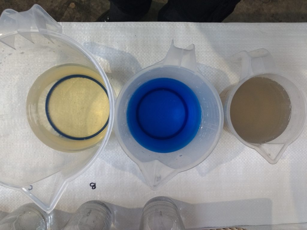 Using 500 ml plastic bottles as mini test columns, we filled each with a known weight of carbon and passed dyed water through them โ iodine for small molecules, methylene blue for medium ones, and a compost-derived DOM solution to mimic the yellowing that develops in tanks. Despite the simplicity of the setup, the results were revealing. Performance varied widely between products, and once the test was corrected for equal carbon mass, the wood-based biochar granules held their own against commercial pellets.